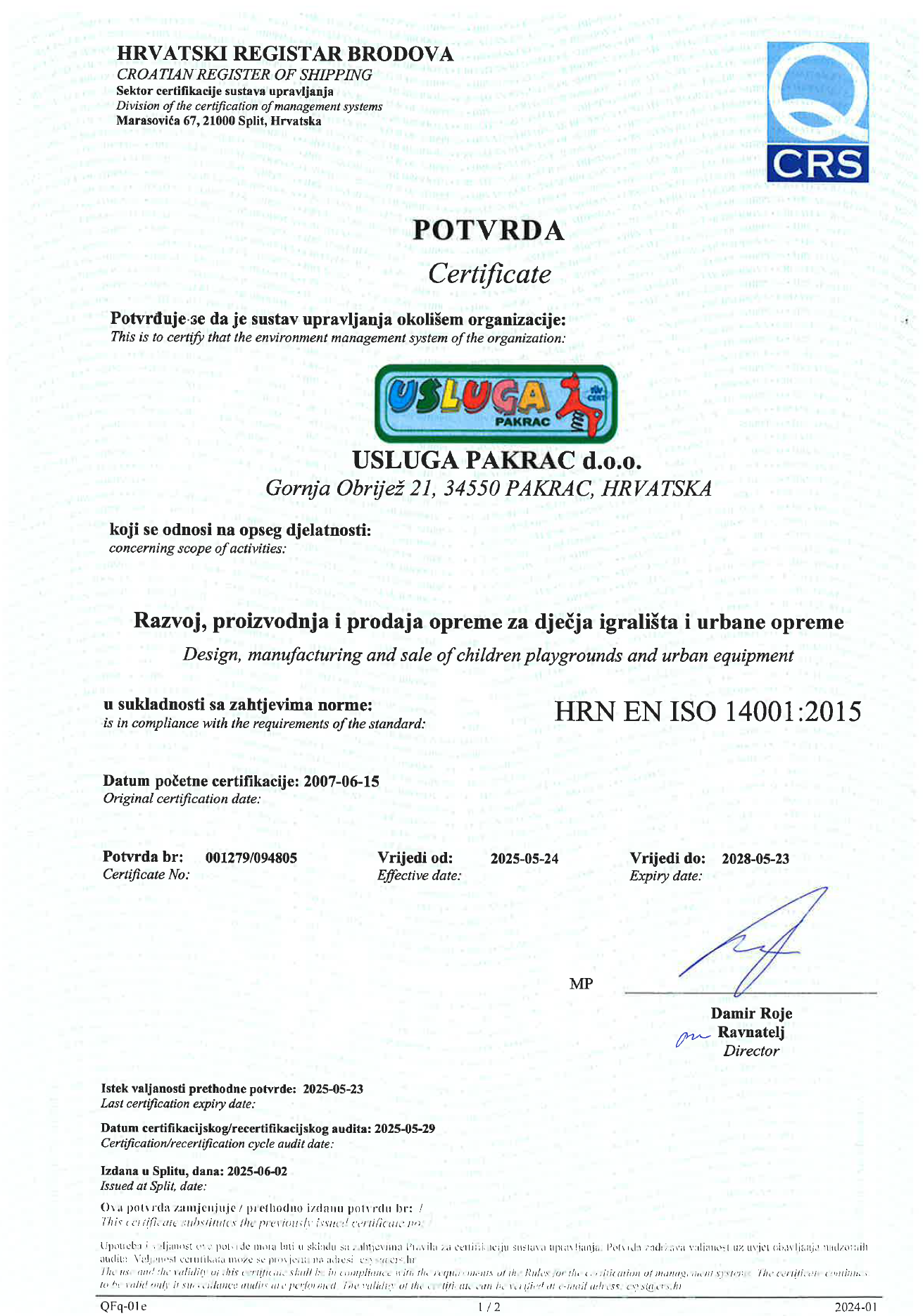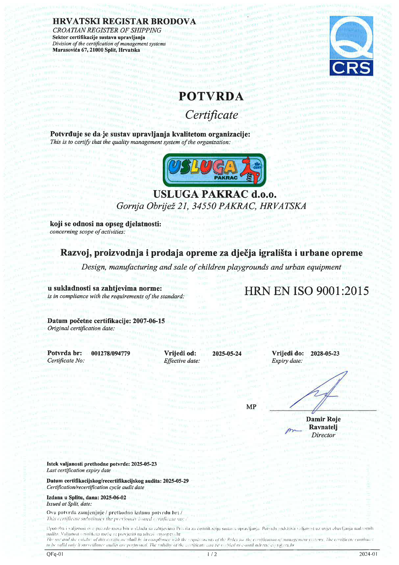 Sigurnost djece za nas predstavlja prioritet, u razvoju i proizvodnji sprava za igru, radi čega Usluga d.o.o. Pakrac, sve svoje prave izrađuje u skladu s europskim standardom EN 1176. Proizvodi posjeduju i TÜV certifikat koji potvrđuje njihovu sigurnost i visoku kvalitetu. Naši vrhunski stručnjaci podržavaju Kupca tijekom procesa planiranja igrališta kako bi jamčili usklađenost projekta s važećim sigurnosnim standardima EU.